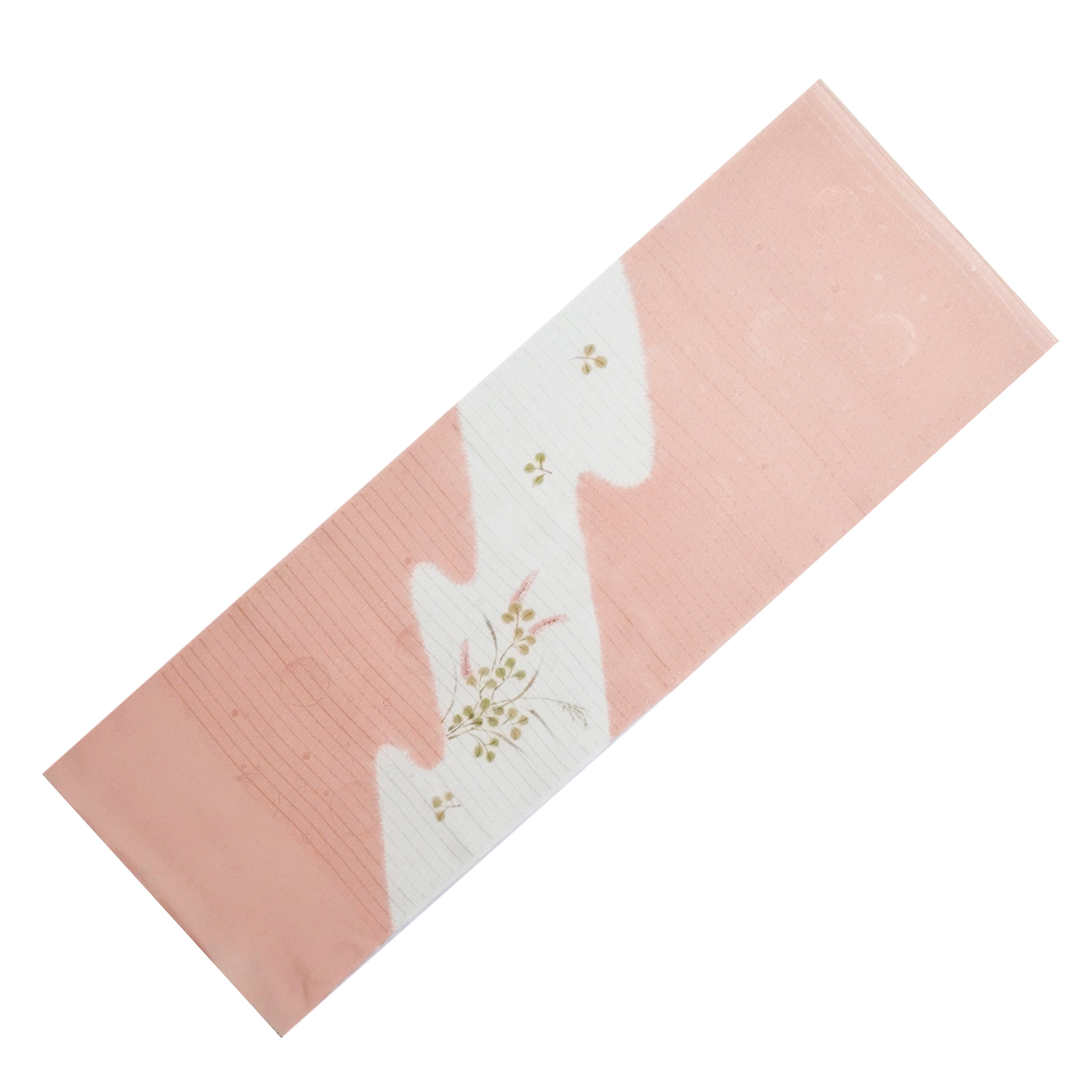 【素材】正絹 絹100% 絽縮緬 柔らかなサーモンピンクの帯揚げ。流れるように描かれた草木と地模様に浮かび上がる水玉が優しい雰囲気です。