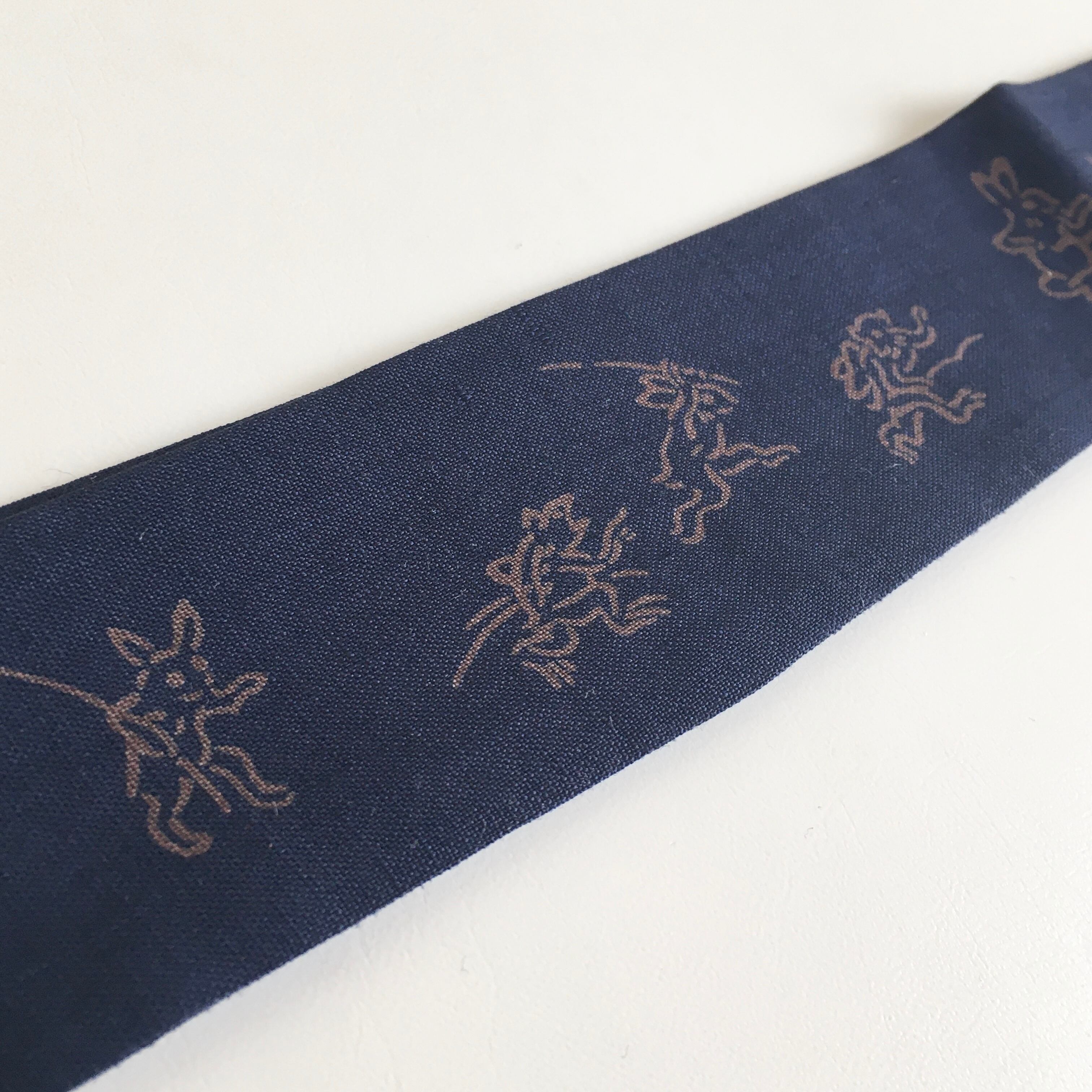 落ち着いた色合いに鳥獣戯画が描かれた、純毛モスリン腰ひもです。