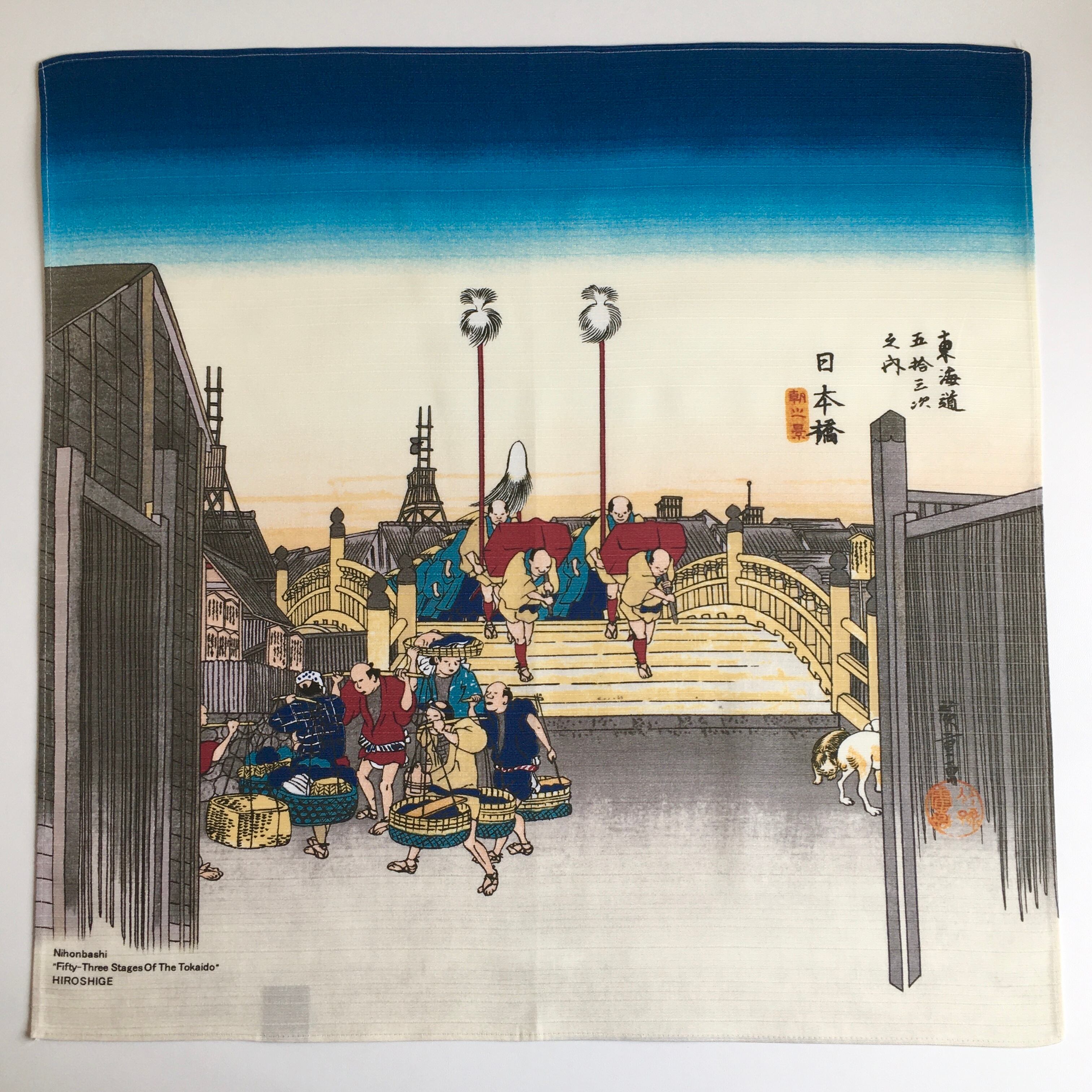 ■歌川広重による「東海道五十三次」シリーズの冒頭を飾る作品です。封建社会の象徴、大名行列が朝早く江戸を出発する様子や、鮮魚の天秤棒を背にした魚海岸の人々。日本橋の様子が、当時の政治的背景や風俗を交えて、いきいきと描かれています。