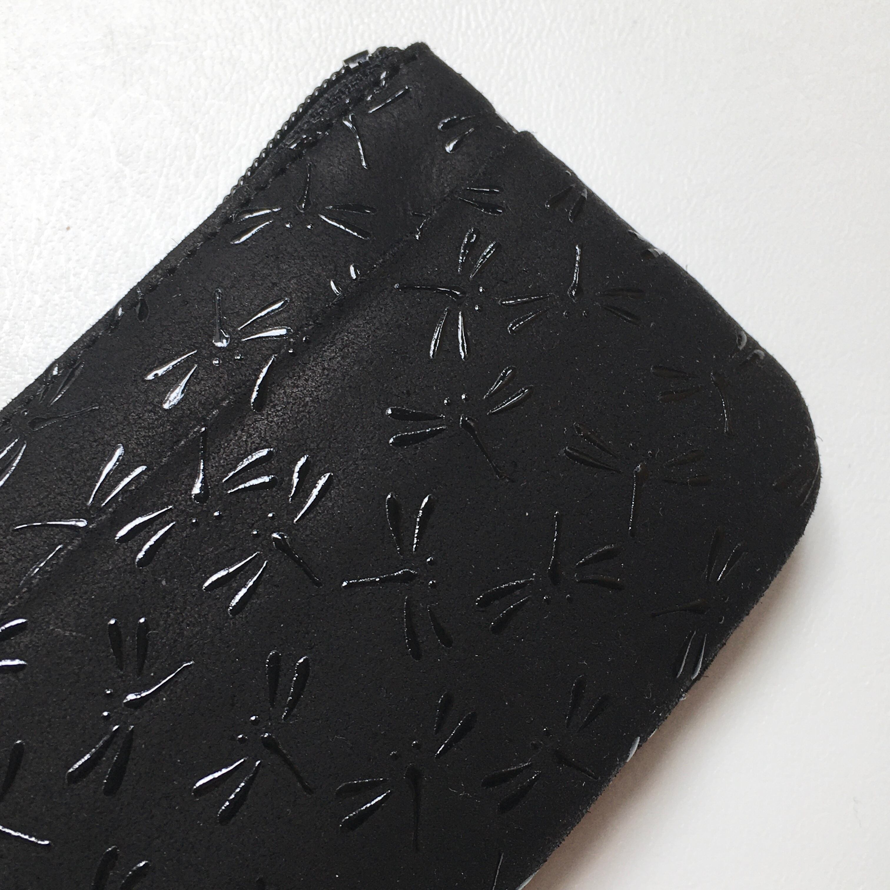 黒地の鹿革に漆で浮かび上がる模様は、蜻蛉。